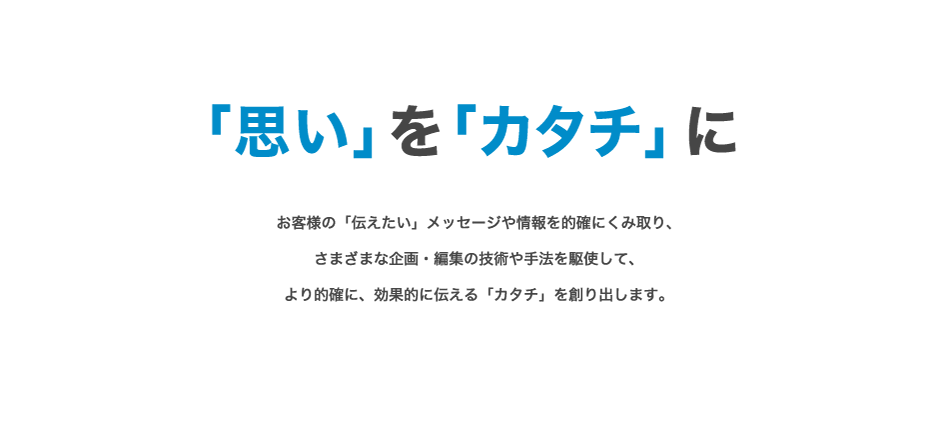 弊社ではクライアントの皆様のユーザーへ伝えたい「思い」をさまざまな手法、コンテンツで魅力ある「カタチ」にしています。